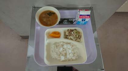 【ごはん 牛乳 豚肉と舞茸の炒め物 つみれ汁 かぼちゃういろう 焼き海苔】