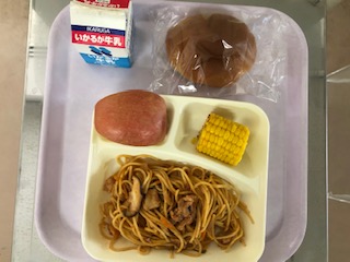 【きのこのスパゲティ 焼きとうもろこし りんご 黒糖パン 牛乳】