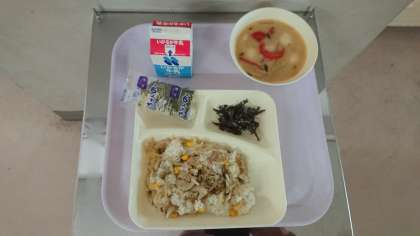【れんこんちらし寿司、牛乳、雑煮、ごまめ】