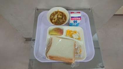【食パン マーマレード 牛乳 豚肉と野菜のカレー煮 カリフラワーとコーンのサラダ 林檎】