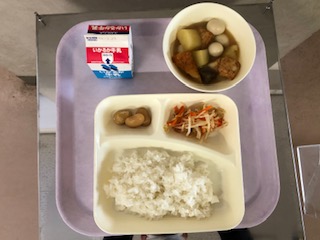 【関東煮 もやしとにんじんの甘酢あえ 白花豆 米飯 牛乳】