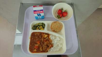 【ポークカレーライス 牛乳 チキンレバーカツ 胡瓜とコーンのサラダ 苺】
