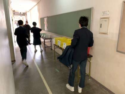 昨日の1年はピロティに2か所の受付を設け書類の受け渡しをし、今日の2年は理科室前に教科書と配布物をセットして出席番号順に並べてあるのを持っていき、3年生は課題を出す所、書類を受け取る所、教科書をもらう所などいくつかポイントを決めていました。同じことをするのでもいろいろ方法があるのだなと感心しました。もちろん前後の人と距離を取り、密集しないように換気のいい場所で行っていました。