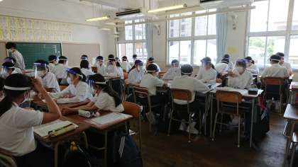 2年生がさっそくフェイスシールドをつける取り組みをしていました。定着するといいですね。