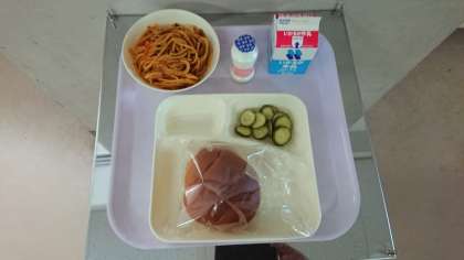 黒糖パン 牛乳 スパゲッティーミートソース 胡瓜のピクルス 発酵乳