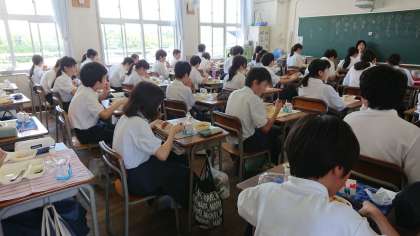 一年生もたくさん話をすることは控えていますが楽しそうに食べていました。スパゲッティーが超大盛りの人もいて、食べる前から満足そうでした。