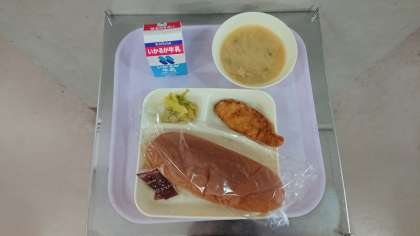 コッペパン いちごジャム 牛乳 サーモンフライ 豆乳スープ キャベツのカレーソテー