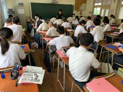 本日3年生は7月26日(日)の田辺模擬原爆慰霊祭に持っていく千羽鶴を6時間目に折りました。