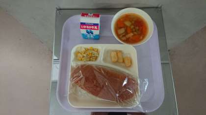 ライ麦パン 牛乳 いか天ぷら フレッシュトマトのスープ煮 サワーソテー
