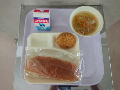 ライ麦パン 牛乳 チキンレバーカツ スープ