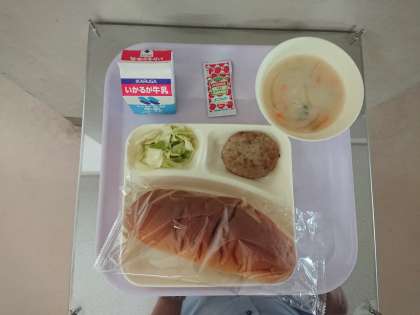 黒糖パン 牛乳 焼きハンバーグ 豆乳スープ キャベツとピーマンのソテー