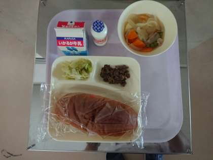 黒糖パン 牛乳 牛肉の香味焼き スープ煮 サワーキャベツ 発酵乳