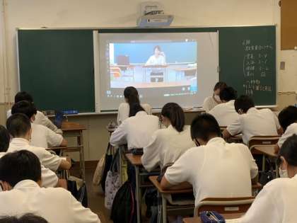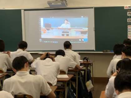 途中で接続が乱れ、口頭での説明に切り替わる場面もありましたが、生徒たちは席に座ってメモなどの書き込みがスムーズにできている様子でした。