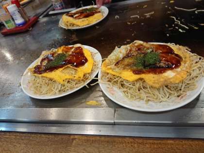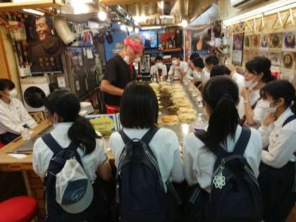 お好み村とお好み共和国で昼食をとっています。とても美味しいお好み焼きでした。ソースが甘くて絶品。キャベツも焼きそばも多く、純粋な広島風です。生徒たちも美味しそうに、でもコロナ対策で無言で食べていました。