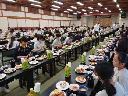 おはようございます。朝早いですが、全員遅れず朝食会場に集合しました。朝食前に退館式を行い、代表の人がホテルの方にお礼の言葉を述べました。