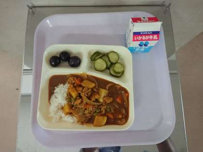 今日の給食☆ チキンカレーライス 牛乳 きゅうりのピクルス ぶどう(巨峰)