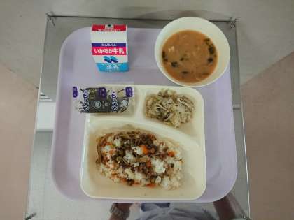 今日の給食☆ 牛肉のきんぴらちらし 牛乳 みそ汁 キャベツの梅じそあえ