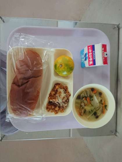 黒糖パン 牛乳 なすのミートグラタン 鶏肉と野菜のスープ みかん