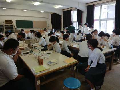 4時間目、2年生が理科の実験をしていました。薬品を使うのでゴーグルをつけています。