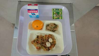 中華丼 牛乳 もやしと三度豆の中華あえ みかん 抹茶大豆