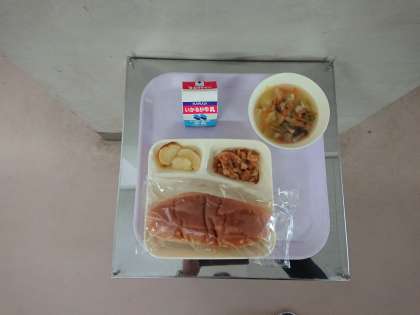 おさつパン 牛乳 鶏肉のバーベキューソテー ウインナーとキャベツのスープ 焼きじゃが