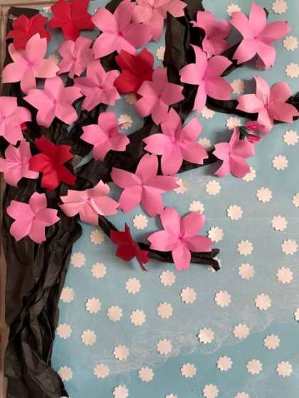 図書室前に桜の花が咲き誇っています。