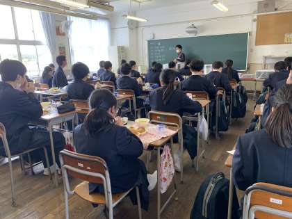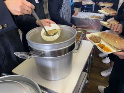 準備に戸惑いながらも、担任の先生の指示を聞き、給食当番の人たちが協力しながら取り組んでいました。