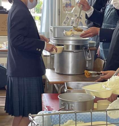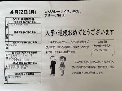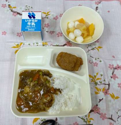 今日の給食は、入学お祝い献立の「カツカレーライス・牛乳・フルーツ白玉」でした。
