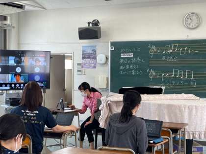 音楽では、「英語の語感と曲の雰囲気を生かして歌おう」と双方向型オンライン学習に取り組みました。
