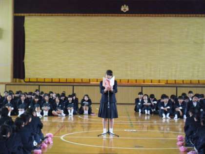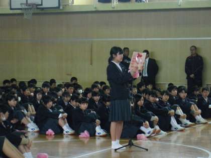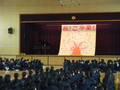 卒業式では全校生徒で3年生を送ることができないので、今日は全校生徒による送別式を行いました。3年生には卒業式当日使用する「コサージュ」と1・2年生による合唱のプレゼントを贈りました。また、3年生からは卒業式で歌う合唱のお返しがありました。生徒会や総務委員が作成した桜の木をイメージした大きなメッセージボードがとても素敵でした。3年生の皆さん、心に残る立派な卒業式にしようね☆