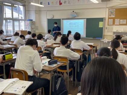 教室の前面に学級目標「個性を尊重しあえるクラス」と掲示されています。