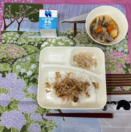 今日の献立は、「ごはん、牛乳、肉じゃが、もやしのゆずの香あえ、ごまかかいため」です。