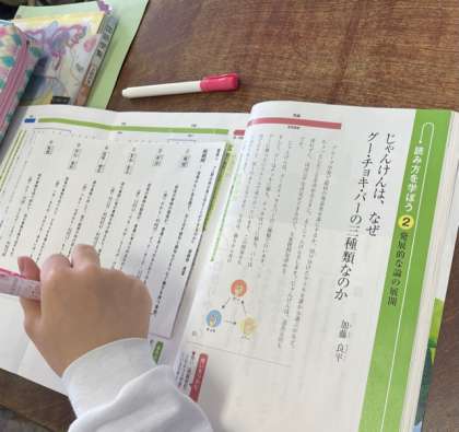 「じゃんけんはなぜグー・チョキ・パーの三種類なのか」を教材に発展的な論の展開について学んでいます。