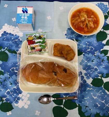 今日の献立は、「レーズンパン、牛乳、一口トンカツ、ミネストローネ、豆こんぶ」です。