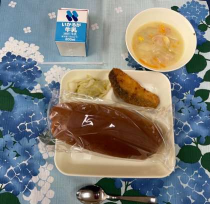 今日の献立は、「黒糖パン、牛乳、サーモンフライ、豆乳スープ、キャベツのソテー 」でした。
