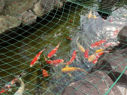 池の鯉も元気ですが、暑さを感じているようで、水の循環口に集まっています。