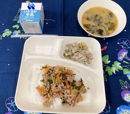 今日の献立は、「豚ひき肉とにらのそぼろ丼、牛乳、みそ汁、キャベツの赤じそあえ」です。