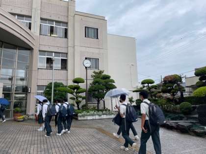 今朝は雨が降ったり、止んだりのなかでの登校でした。