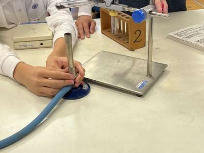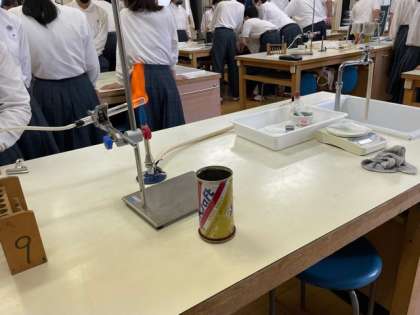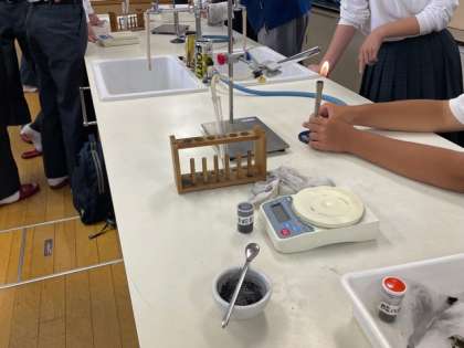 理科では、酸化銅から酸素をとる化学変化について実験を行っています。