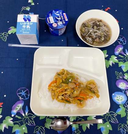 今日の献立は、「和風カレー丼、牛乳、もずくとオクラのとろり汁、ヨーグルト」です。