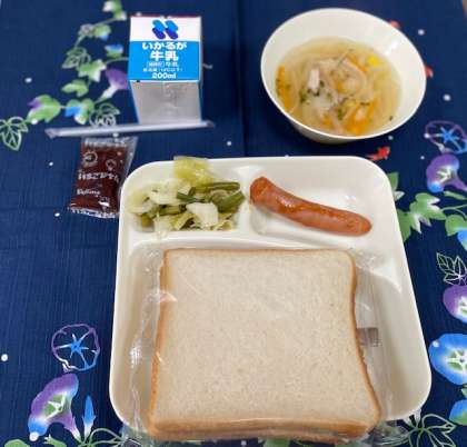 今日の献立は、「食パン、いちごジャム、牛乳、ウインナーのケチャップソース、スープ、キャベツとさんどまめのサラダ」です。