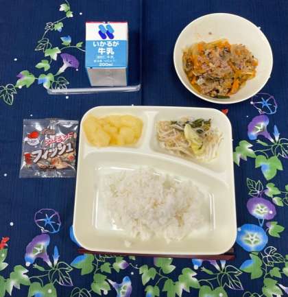 今日の献立は、「ごはん、牛乳、マーボーはるさめ、チンゲンサイともやしの甘酢あえ、アーモンドフィッシュ、洋なし(カット缶)」でした。