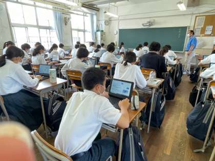 タブレットを活用して、調べたことを発表しています。