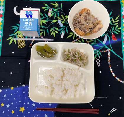 今日の献立は、「ごはん、牛乳、すき焼き煮、オクラのかつお梅風味、もやしとピーマンのごまいため」でした。