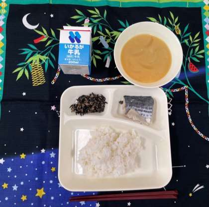 今日の献立は、「ごはん、牛乳、さごしの塩焼き、みそ汁、牛ひじきそぼろ」でした。