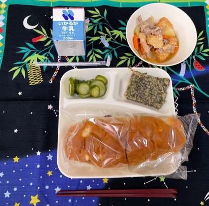 今日の献立は、「おさつパン、牛乳、もずく入りヒラヤーチー、豚肉とあつあげの煮もの、あっさりきゅうり」でした。