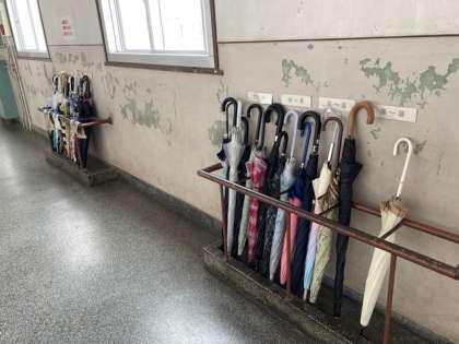 傘がきれいに傘立てに入れられています。