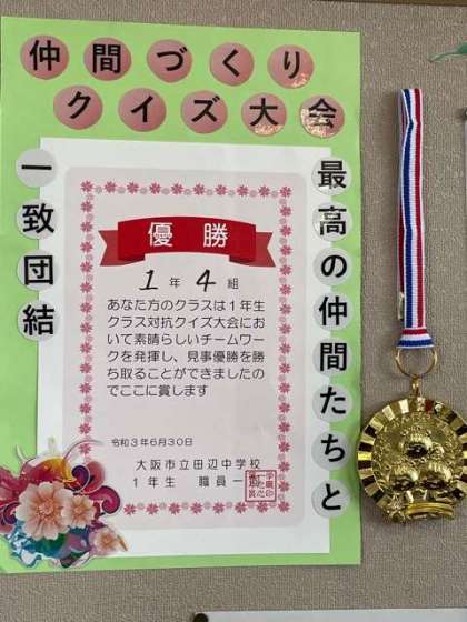 教室には、先日のクイズ大会の優勝の賞状とメダルが飾られています。