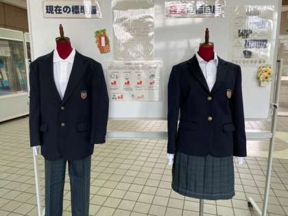 本日配付したプリントのとおり、標準服の一部変更を検討しています。懇談期間中、ピロティに標準服の見本を展示していますので、令和4年度より変更予定の生地等をみていただくようお願いいたします。