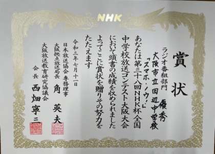NHK杯全国中学校放送コンテスト大阪大会で、ラジオ番組部門で優秀賞を受賞しました。